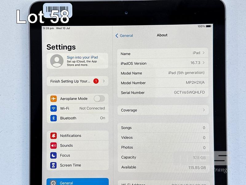 APPLE iPAD 5TH GEN, 128GB, Wi-Fi, SPACE GREY, MODEL MP2H2X/A, A1822 (NO CABLE, NO CHARGER) S/N:GCTV65WQHLFD