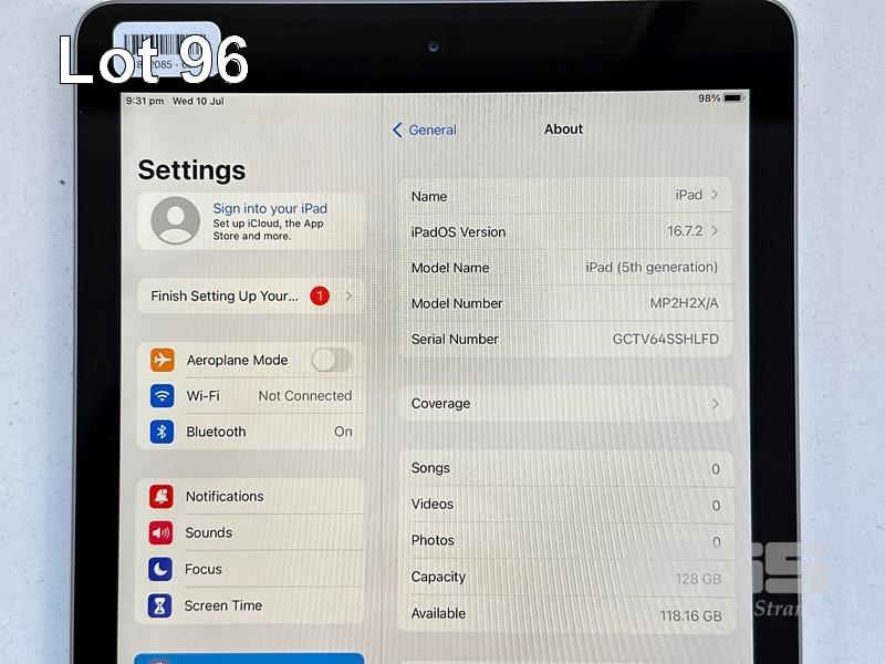 APPLE iPAD 5TH GEN, 128GB, Wi-Fi, SPACE GREY, MODEL MP2H2X/A, A1822 (NO CABLE, NO CHARGER) S/N:GCTV64SSHLFD