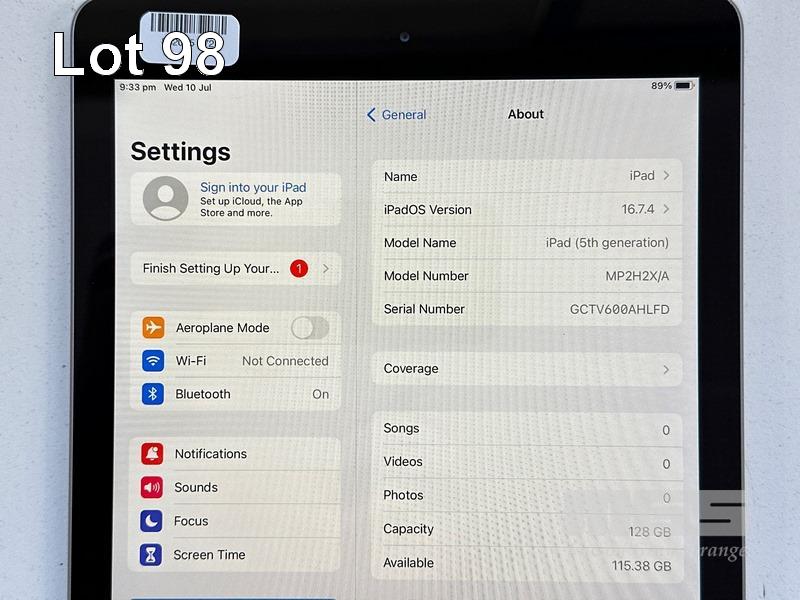APPLE iPAD 5TH GEN, 128GB, Wi-Fi, SPACE GREY, MODEL MP2H2X/A, A1822 (NO CABLE, NO CHARGER) S/N:GCTV600AHLFD