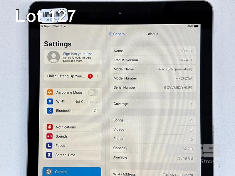 APPLE iPAD 5TH GEN, 32GB, Wi-Fi, SPACE GREY, MODEL MP2F2X/A, A1822 (NO CABLE, NO CHARGER) S/N:GCVVM8XYHLF9