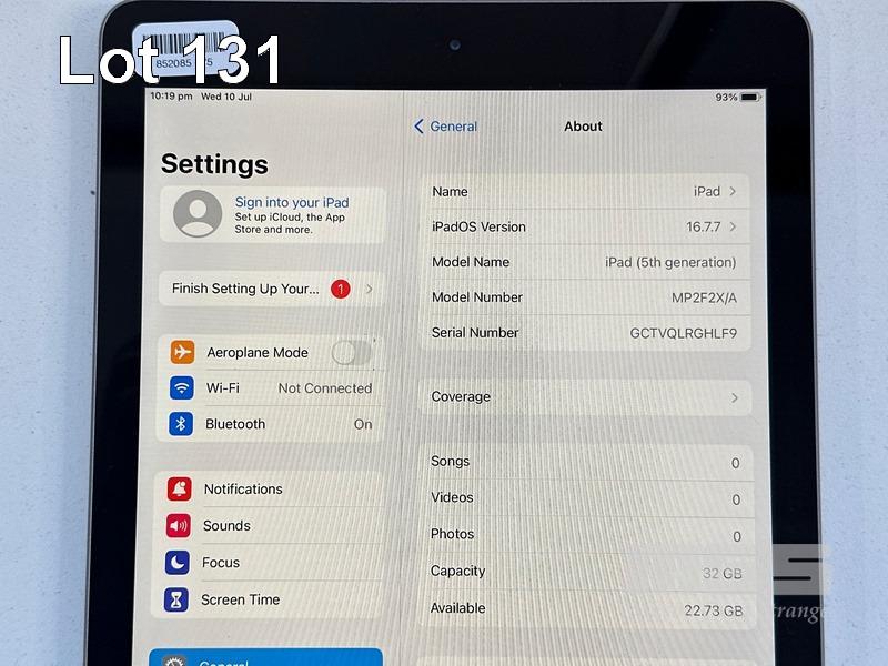 APPLE iPAD 5TH GEN, 32GB, Wi-Fi, SPACE GREY, MODEL MP2F2X/A, A1822 (NO CABLE, NO CHARGER) S/N:GCTVQLRGHLF9