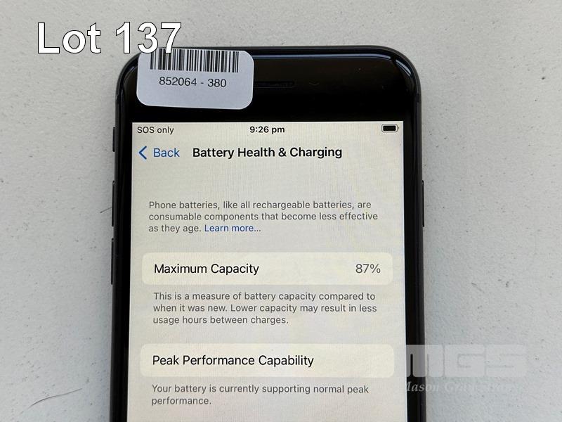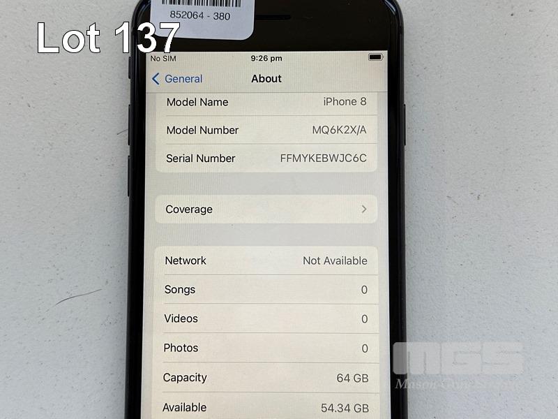 APPLE iPHONE 8, 64GB, SPACE GREY, MODEL MQ6K2X/A, BATTERY HEALTH 87% (NO CABLE, NO CHARGER) (NOTE: MINOR DAMAGE BOTTOM FRONT RIGHT CORNER) S/N:FFMYKEBWJC6C