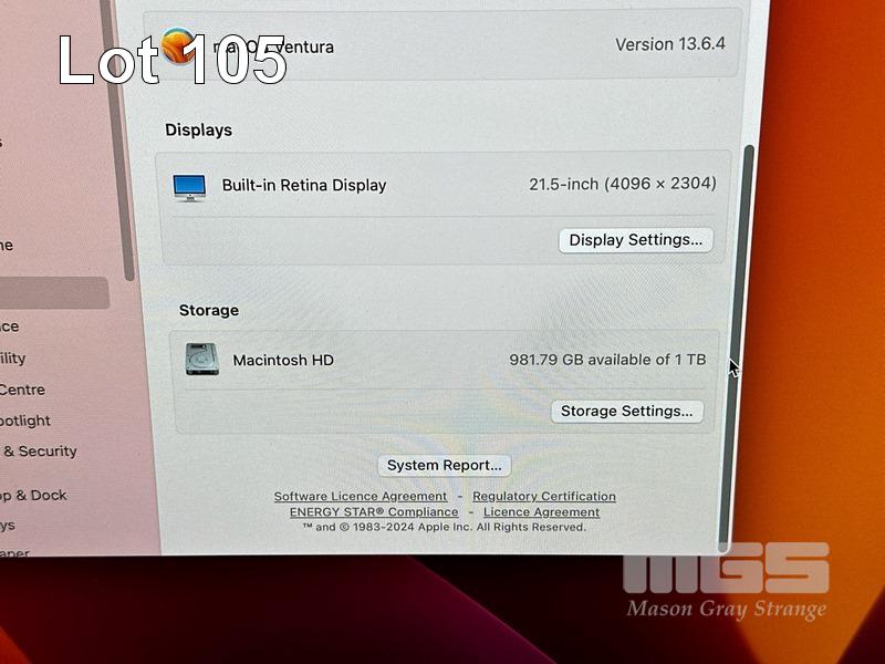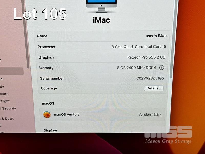 APPLE iMAC (A1418), CORE i5 7400 (7TH GEN) @ 3GHz, 8GB DDR4 RAM, 1TB SATA HDD, BUILT-IN 21.5" RETINA DISPLAY (4096x2304), 2GB RADEON PRO 555 VIDEO, Wi-Fi, BLUETOOTH, MAC OS 13 INSTALLED, WIRELESS KEYBOARD (A1644) & MOUSE (A1657) S/N:C02V92B6J1G5