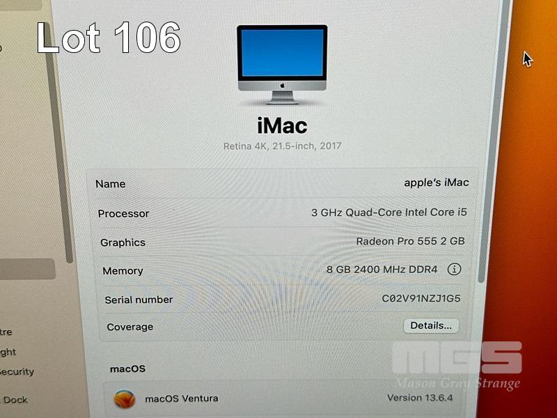 APPLE iMAC (A1418), CORE i5 7400 (7TH GEN) @ 3GHz, 8GB DDR4 RAM, 1TB SATA HDD, BUILT-IN 21.5" RETINA DISPLAY (4096x2304), 2GB RADEON PRO 555 VIDEO, Wi-Fi, BLUETOOTH, MAC OS 13 INSTALLED, WIRELESS KEYBOARD (A1644) & MOUSE (A1657) S/N:C02V91NZJ1G5