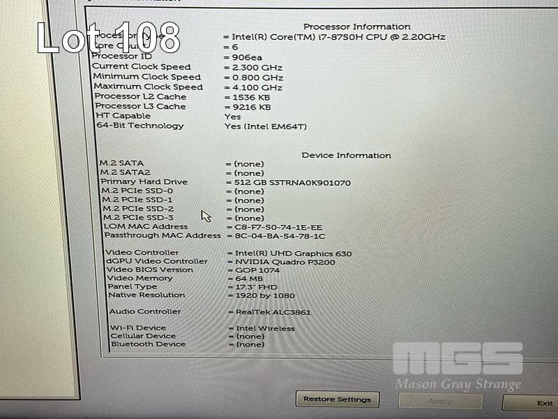 LAPTOP, DELL PRECISION 7730, CORE i7 8750H (8TH GEN) @ 2.2GHz, 64GB DDR4 RAM, 512GB NVMe M.2 SSD, 17.3" WIDESCREEN (1920x1080), 6GB NVIDIA QUADRO P3200 VIDEO, Wi-Fi, WINDOWS 11 PRO INSTALLED & POWER SUPPLY S/N:5Q61QV2