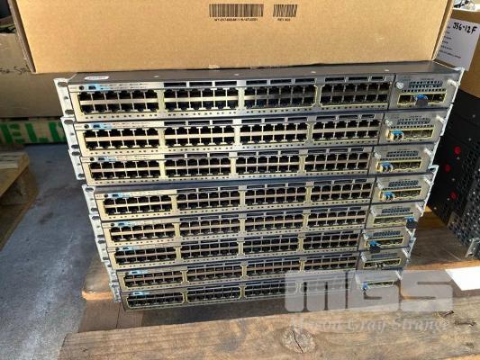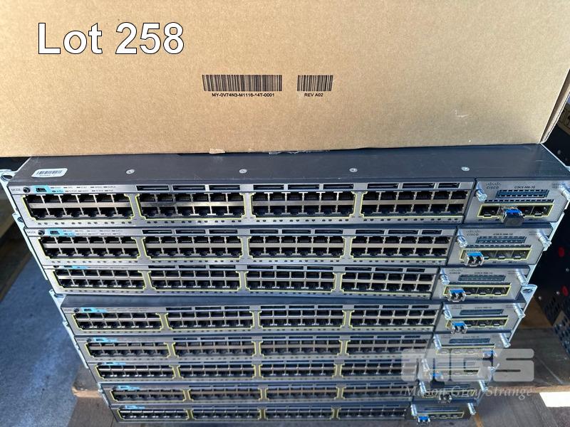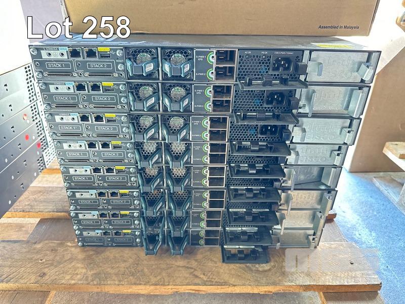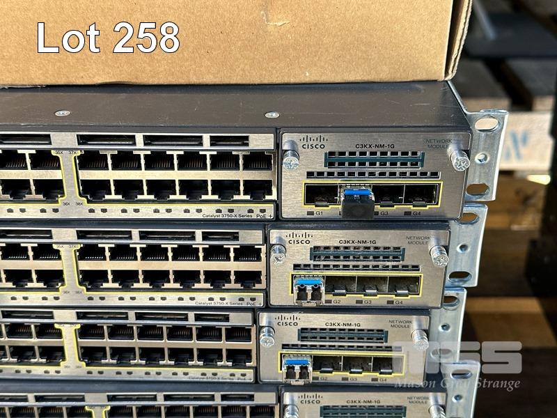 8 x CISCO CATALYST 3750-X SERIES 48-PORT SWITCHES, WS-C3750X-48P-S V05 EACH WITH C3KX-NM-1G NETWORK MODULE, STACK CABLES & IEC-C15 NOTCH POWER CABLES