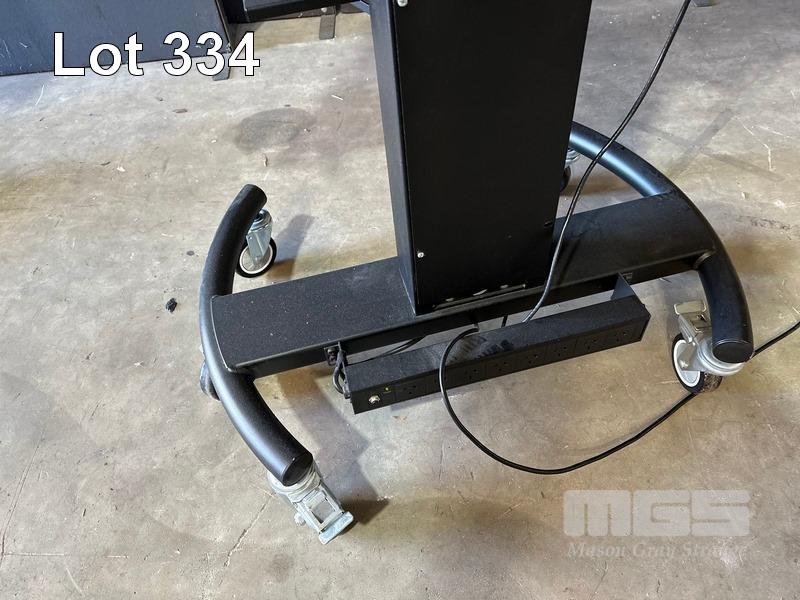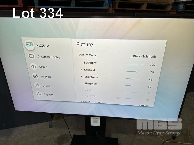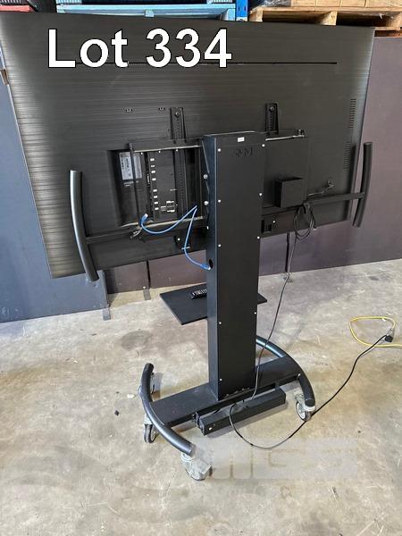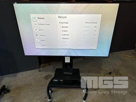 SAMSUNG QM65H SERIES 65" UHD COMMERCIAL LED LCD DISPLAY, LH65QMHPLGC/XY ON AMM MOBILE STAND WITH NETWORK SWITCH & POWER BOARD (NOTE: SCRATCHES ON SCREEN)