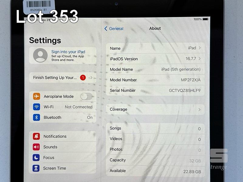 APPLE iPAD 5TH GEN, 32GB, Wi-Fi, SPACE GREY, MODEL MP2F2X/A, A1822 (NO CABLE, NO CHARGER) S/N:GCTVQZ85HLF9