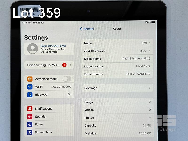 APPLE iPAD 5TH GEN, 32GB, Wi-Fi, SPACE GREY, MODEL MP2F2X/A, A1822 (NO CABLE, NO CHARGER) S/N:GCTVQWARHLF9