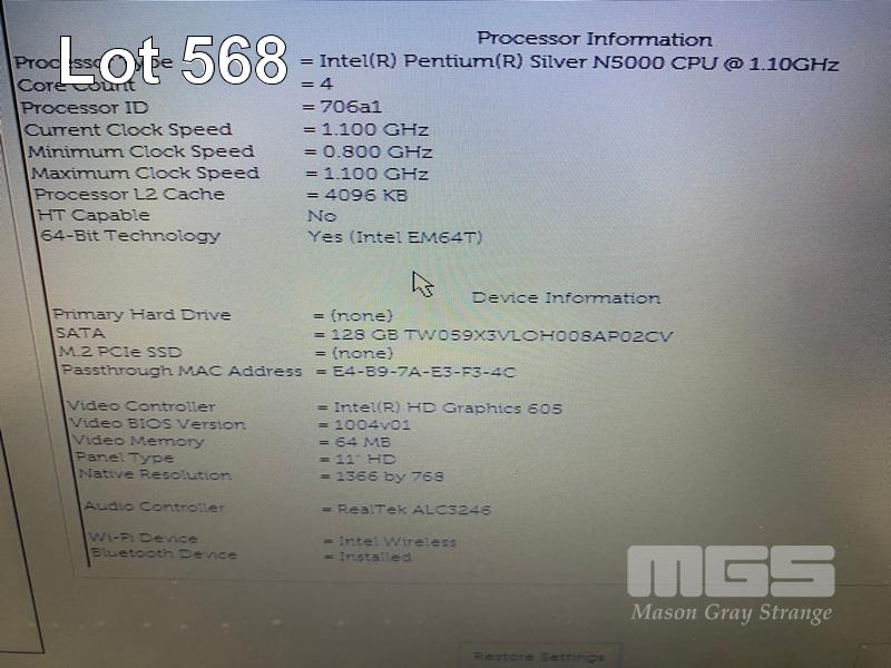 LAPTOP, DELL LATITUDE 3190, PENTIUM SILVER N5000 @ 1.1GHz, 4GB DDR4 RAM, 128GB M.2 SSD, 11.6" WIDESCREEN (1366x768), INTEL UHD GRAPHICS 605, Wi-Fi, BLUETOOTH, WINDOWS 11 PRO EDUCATION INSTALLED & POWER SUPPLY S/N:5Q476S2