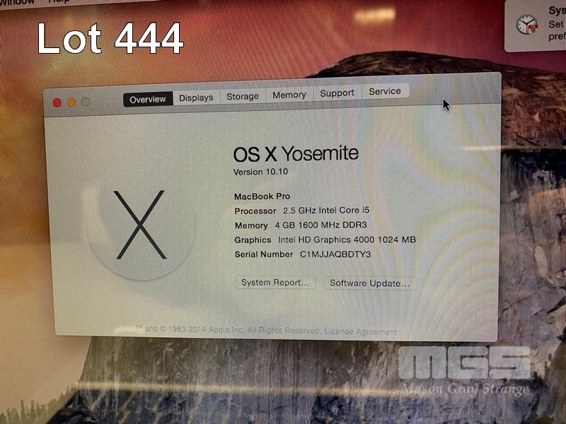 LAPTOP, APPLE MACBOOK PRO (A1278), CORE i5 3210M (3RD GEN) @ 2.5GHz, 4GB DDR3 RAM, 500GB SATA HDD, DVD-RW, 13.3" DISPLAY (1280x800), INTEL HD VIDEO, Wi-Fi, BLUETOOTH, MAC OS 10.10 INSTALLED & POWER SUPPLY S/N:C1MJJAQBDTY3