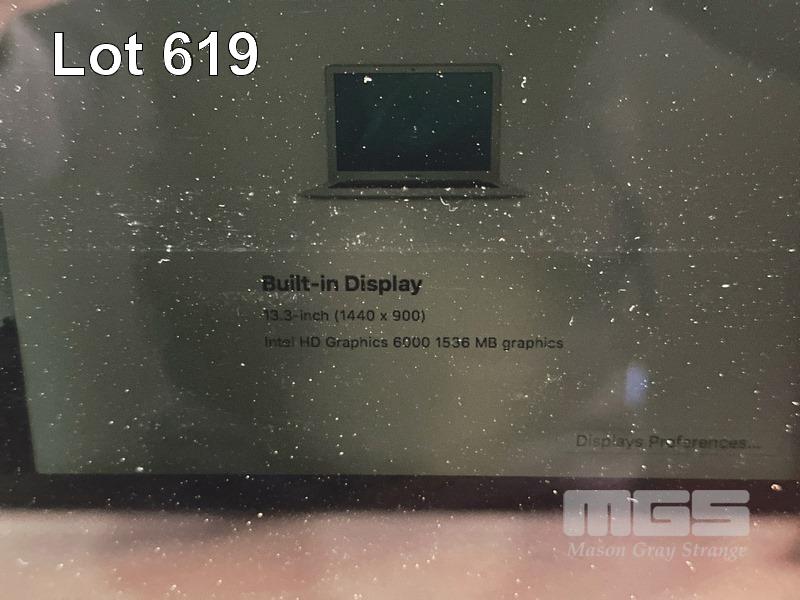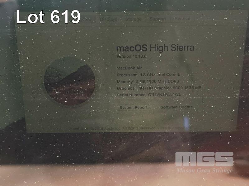 LAPTOP, APPLE MACBOOK AIR (A1466), CORE i5 5350U (5TH GEN) @ 1.8GHz, 8GB DDR3 RAM, 256GB SSD, 13.3" DISPLAY (1440x900), INTEL HD GRAPHICS 6000, Wi-Fi, BLUETOOTH, MAC OS 10.13 INSTALLED (NO POWER SUPPLY) (NOTE: FAULTY SCREEN BACKLIGHT, MARKS ON SCREEN) S/N:C1MVN5WJJ1WL