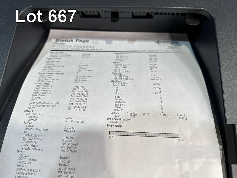 PRINTER, KYOCERA ECOSYS P3045dn LASER, 189,013 PAGES (TEST PAGE ATTACHED) S/N:VM58304076