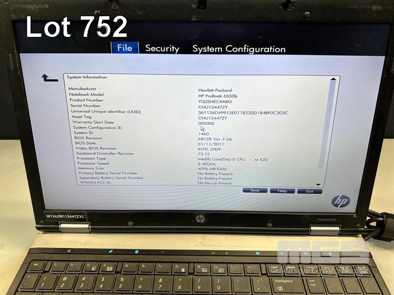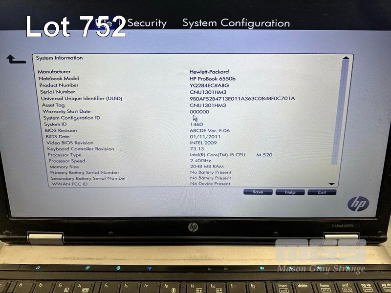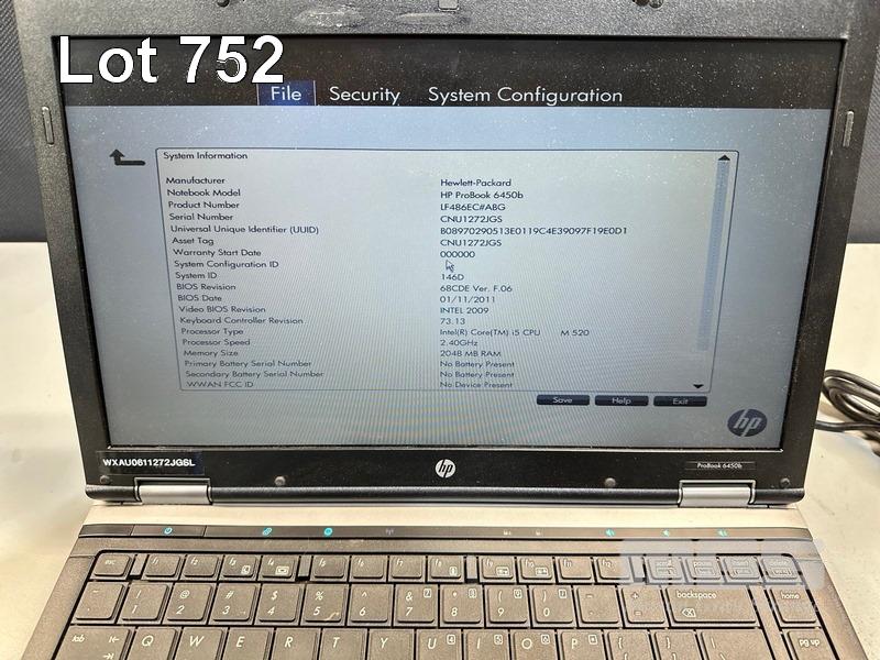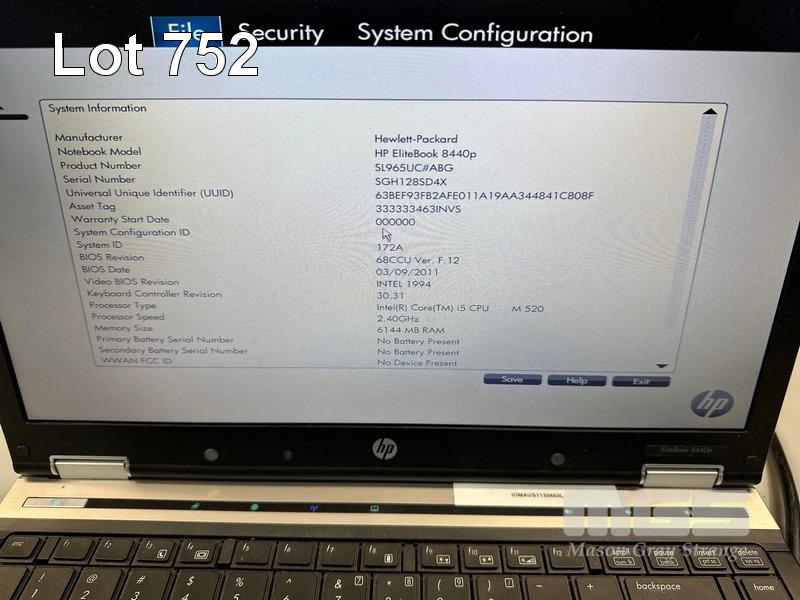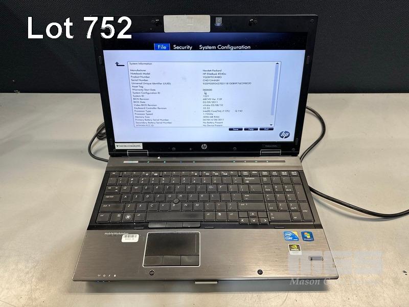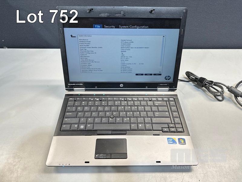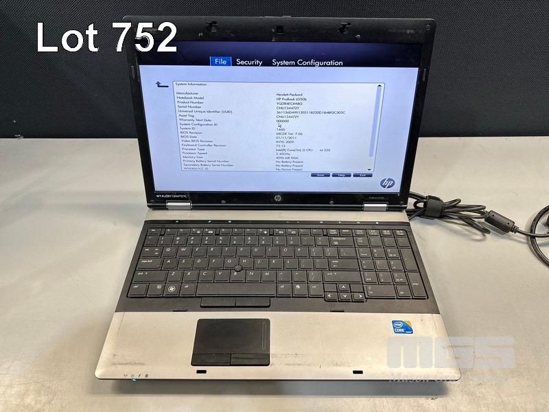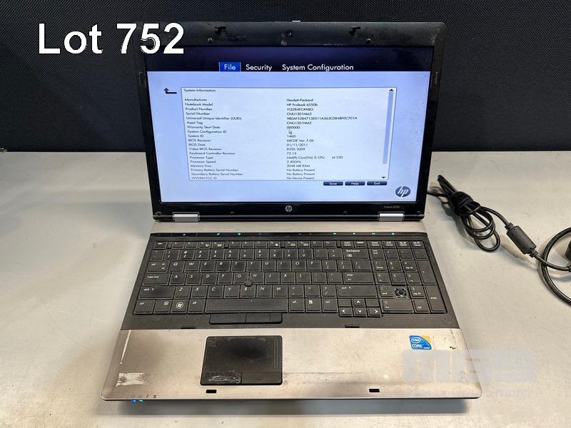 6 x LAPTOPS INC. - HP ELITEBOOK 8540w, CORE i7 Q740 @ 1.7GHz, 4GB RAM, 250GB HDD - HP ELITEBOOK 8560w, NO RAM, NO HDD (FAULTY) - HP ELITEBOOK 8440p, CORE i5 M520 @ 2.4GHz, 6GB RAM, 250GB HDD - HP PROBOOK 6450b, CORE i5 M520 @ 2.4GHz, 2GB RAM, 250GB HDD (FAULTY KEYBOARD) - HP PROBOOK 6550b, CORE i5 M520 @ 2.4GHz, 4GB RAM, 250GB HDD - HP PROBOOK 6550b, CORE i5 M520 @ 2.4GHz, 2GB RAM, 250GB HDD (NO POWER SUPPLIES) S/N:CND1244HJH, 5CB1492RK0, SGH128SD4X, CNU1272JGS, CNU13447ZY, CNU1301HM3