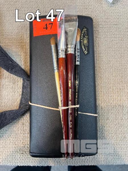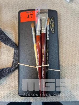 9 x ASSORTED ARTIST BRUSHES, GOLDEN NYLON, SABLE, SQUIRREL, WITH HARD SHELL PALLET CASE