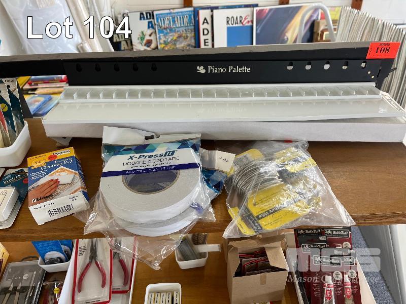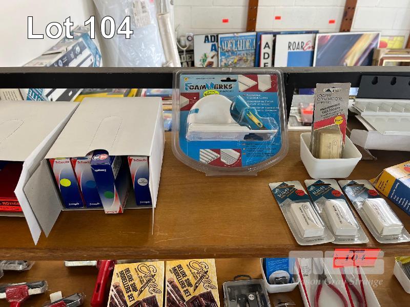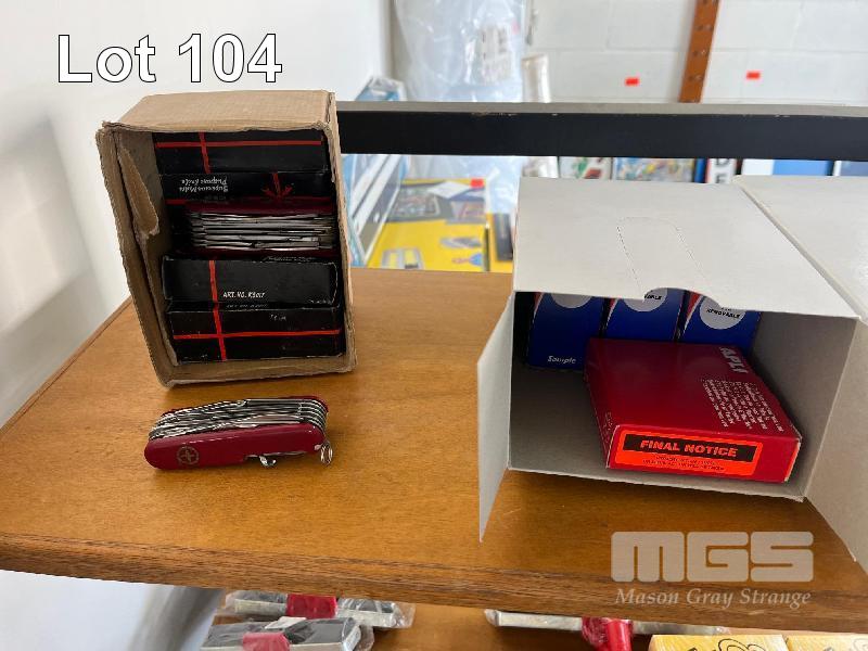 CONTENTS OF SHELF, SWISS ARMY KNIVES, LABELS, V GROOVE CUTTER, BLADES, DOUBLE SIDED TAPE ETC.