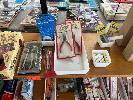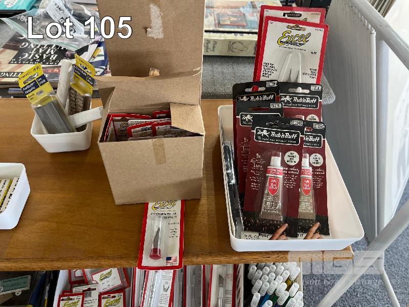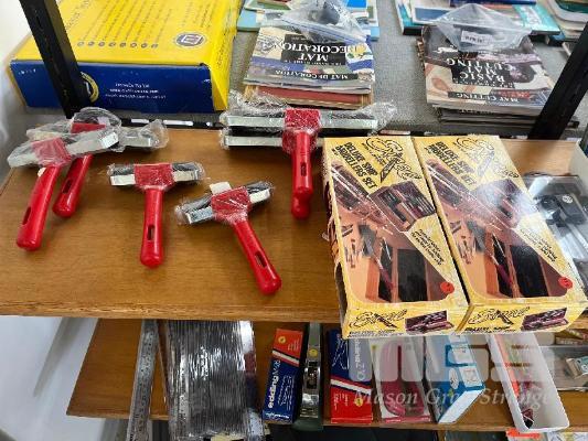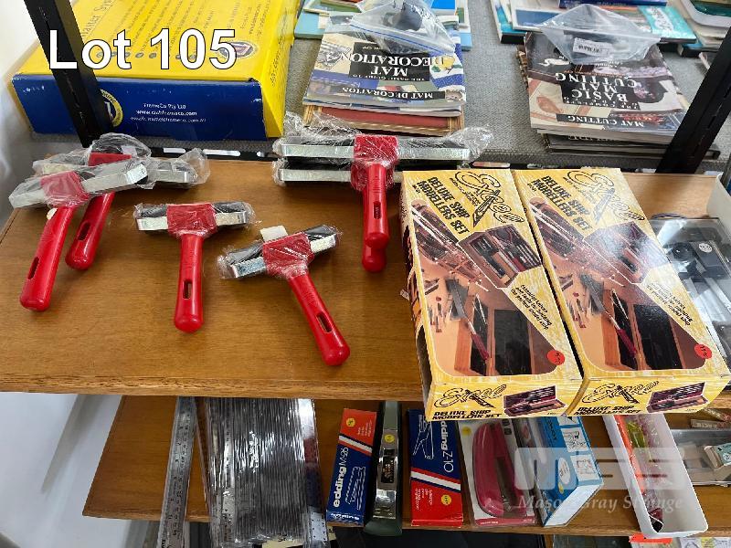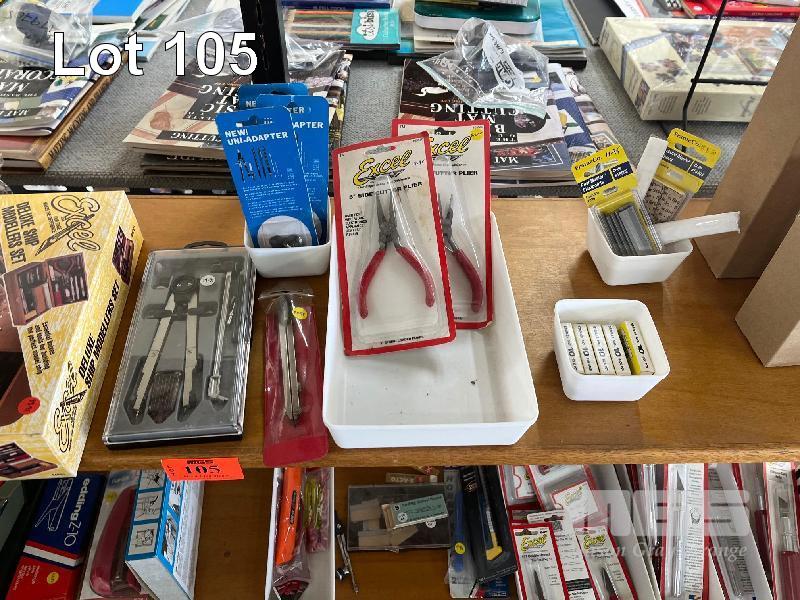 CONTENTS OF SHELF, LINO ROLLERS, MODELLERS SET, COMPASSES, PLIERS, FRAME POLISH ETC.