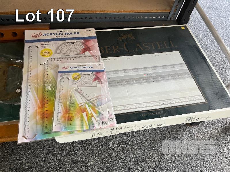 CONTENTS OF SHELF, DRAWING BOARD, RULER SETS, ASSORTED TRAVEL FOLDERS ETC.