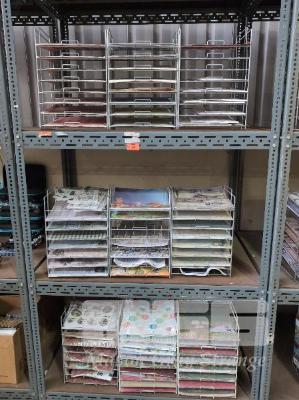 9 X CRAFT PAPER DISPLAY RACKS & CONTENTS. 3 X SHELVES.