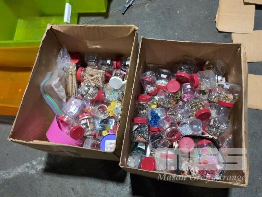 100 (APPROX) X ASSORTED JARS WITH CONTENTS OF PINS, CHARMS, BUTTONS ETC. 2 X BOXES.
