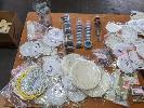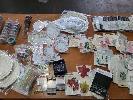 ASSORTED DOILIES, CHARMS, RHINESTONES, PINS, SEQUINS, FLOWERS ETC. 2 X BOXES.