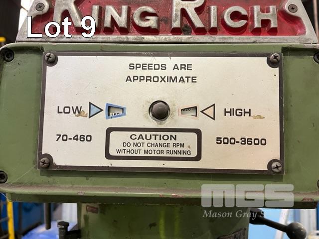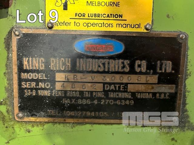 KING RICH TURRET HEAD MILL, MOD: KR-V30009L SERIAL: 4852, 5hp 415V MOTOR, INT 40 TAPER, TABLE: 1470 x 300mm, WITH HORIZONTAL MILLING ATTACHMENT, POWER TO X AXIS & KNEE, 70 TO 3600 RPM , CONDITION UNKNOWN. MADE IN TAIWAN