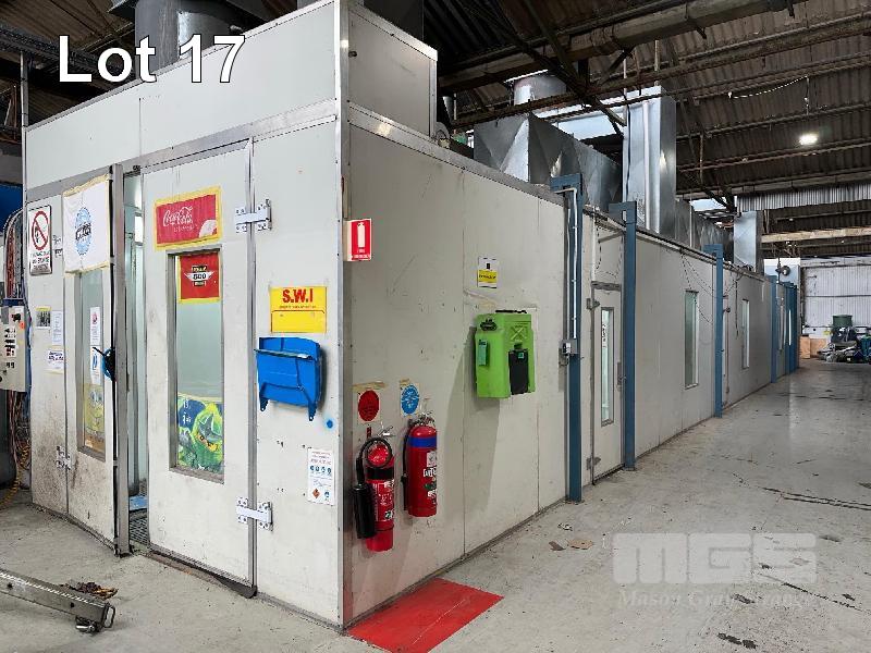 MONARCH ULTRA FINISH PRODUCTION SPRAY BOOTH COMPRISING OF PREP AREA: 6000 x 4000mm SPRAY BOOTH: 9000 x 4000mm BAKE BOOTH: 9000 x 4000mm DOWN DRAFT SYSTEM , FLOOR GRATING, LIGHTING, VENTILATION & FILTERING SYSTEM, POSITIVE PRESSURE SYSTEM , GAS FIRED HEATING, INTERNAL & PA DOORS, WINDOWS