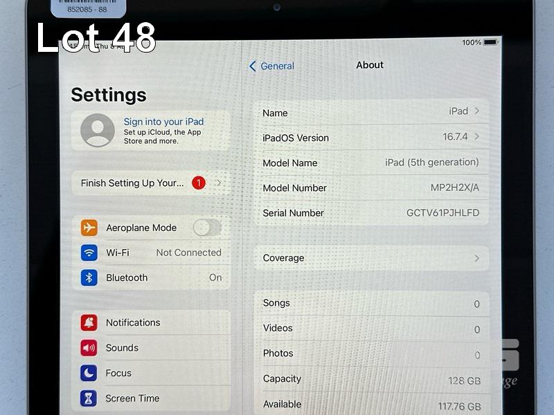 APPLE iPAD 5TH GEN, 128GB, Wi-Fi, SPACE GREY, MODEL MP2H2X/A, A1822 (NO CABLE, NO CHARGER) S/N:GCTV61PJHLFD