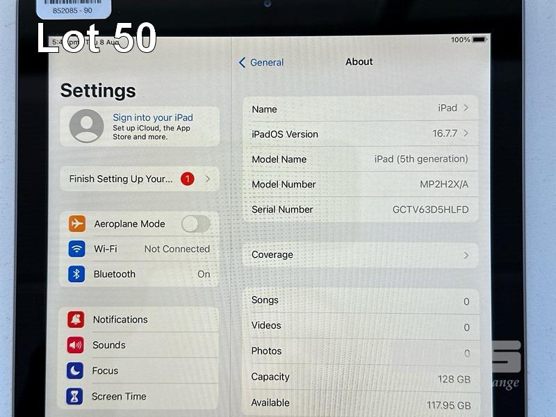 APPLE iPAD 5TH GEN, 128GB, Wi-Fi, SPACE GREY, MODEL MP2H2X/A, A1822 (NO CABLE, NO CHARGER) S/N:GCTV63D5HLFD