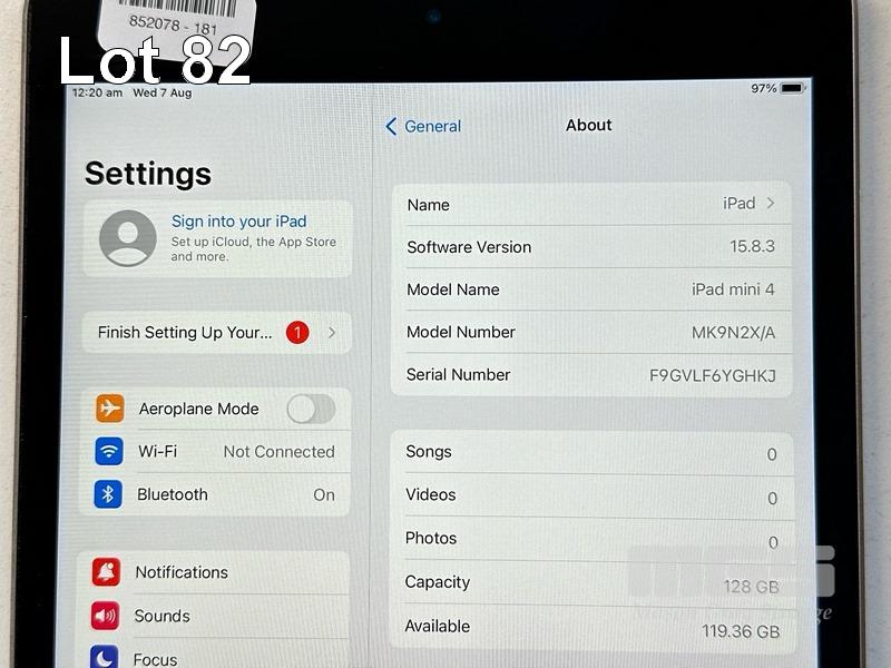 APPLE iPAD MINI 4TH GEN, 128GB, Wi-Fi, SPACE GREY, MODEL MK9N2X/A, A1538 WITH COVER (NO CABLE, NO CHARGER) S/N:F9GVLF6YGHKJ