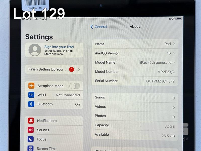 APPLE iPAD 5TH GEN, 32GB, Wi-Fi, SPACE GREY, MODEL MP2F2X/A, A1822 (NO CABLE, NO CHARGER) S/N:GCTVMZJCHLF9