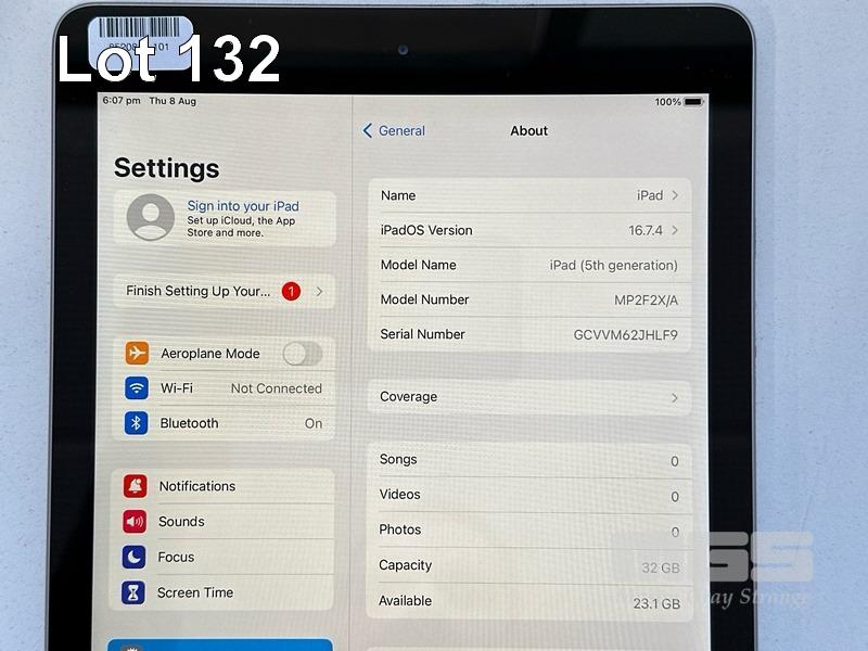 APPLE iPAD 5TH GEN, 32GB, Wi-Fi, SPACE GREY, MODEL MP2F2X/A, A1822 (NO CABLE, NO CHARGER) S/N:GCVVM62JHLF9