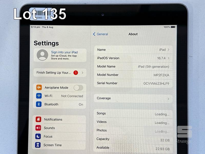 APPLE iPAD 5TH GEN, 32GB, Wi-Fi, SPACE GREY, MODEL MP2F2X/A, A1822 (NO CABLE, NO CHARGER) S/N:GCVVM623HLF9
