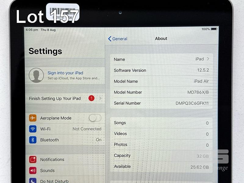 APPLE iPAD AIR, 32GB, Wi-Fi, SPACE GREY, MODEL A1474, MD786X/B (NO CABLE, NO CHARGER) (NOTE: MINOR DAMAGE ON SCREEN) S/N:DMPQ3C6GFK11