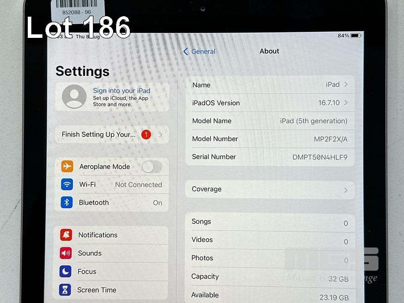APPLE iPAD 5TH GEN, 32GB, Wi-Fi, SPACE GREY, MODEL MP2F2X/A, A1822 (NO CABLE, NO CHARGER) (NOTE: CASING FADED ON BACK) S/N:DMPT50N4HLF9