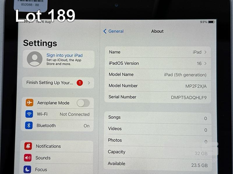 APPLE iPAD 5TH GEN, 32GB, Wi-Fi, SPACE GREY, MODEL MP2F2X/A, A1822 (NO CABLE, NO CHARGER) (NOTE: SCRATCHES ON SCREEN, CASING FADED ON BACK) S/N:DMPT5ADQHLF9