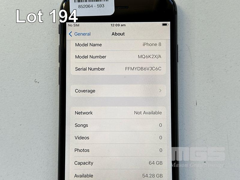 APPLE iPHONE 8, 64GB, SPACE GREY, MODEL MQ6K2X/A, BATTERY HEALTH 90% (NO CABLE, NO CHARGER) (NOTE: DAMAGED BACK, MINOR SCRATCHES ON SCREEN) S/N:FFMYDB6VJC6C