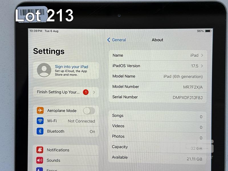 APPLE iPAD 6TH GEN, 32GB, Wi-Fi, SPACE GREY, MODEL MR7F2X/A, A1893 (NO CABLE, NO CHARGER) (NOTE: SCRATCHES ON SCREEN) S/N:DMPXDFJ1JF8J