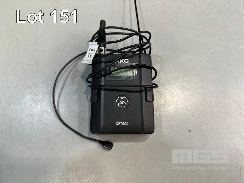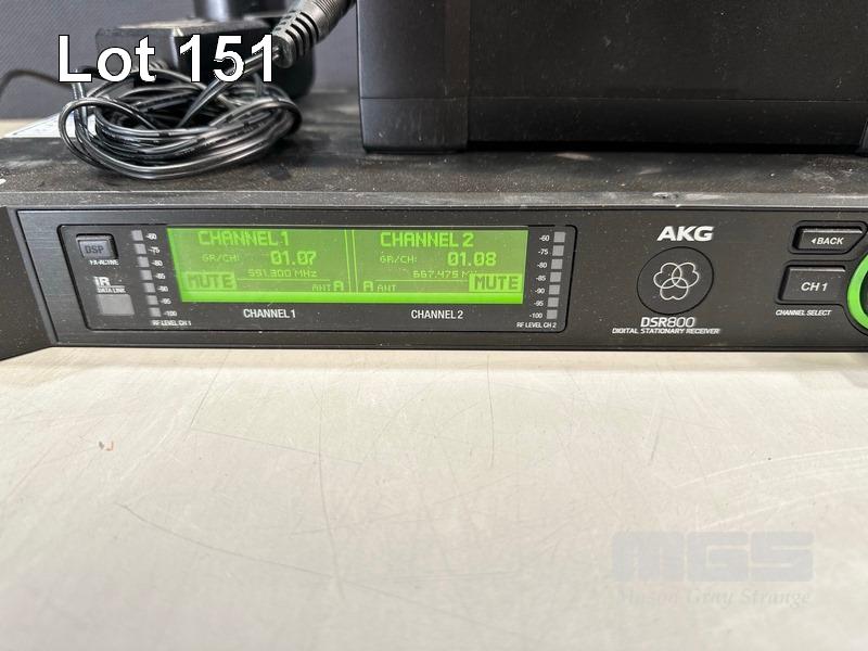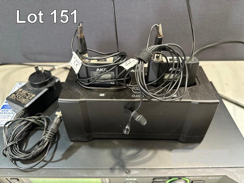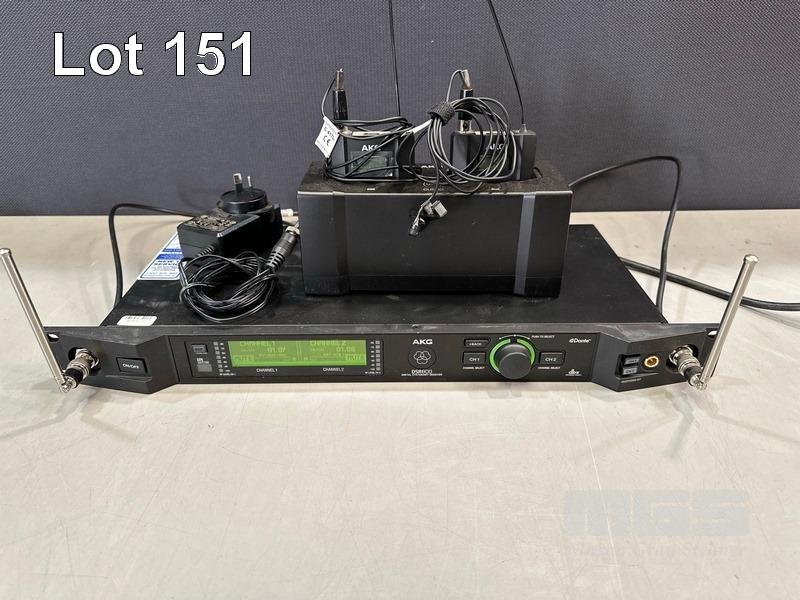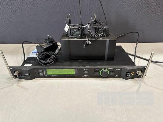 AKG DSR800 DIGITAL WIRELESS STATIONARY RECEIVER WITH 2 x AKG DPT800 BODYPACK TRANSMITTERS, 2 x LAPEL MICROPHONES, 1 x AKG CU800 CHARGING UNIT & 1 x POWER SUPPLY S/N:VT3867-007264