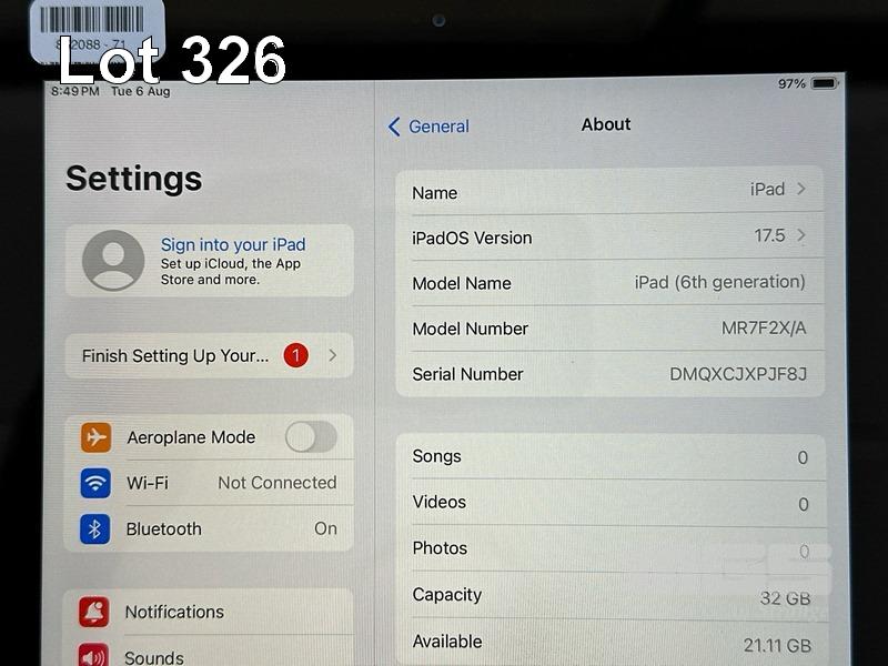 APPLE iPAD 6TH GEN, 32GB, Wi-Fi, SPACE GREY, MODEL MR7F2X/A, A1893 (NO CABLE, NO CHARGER) S/N:DMQXCJXPJF8J