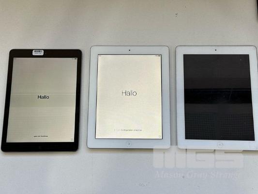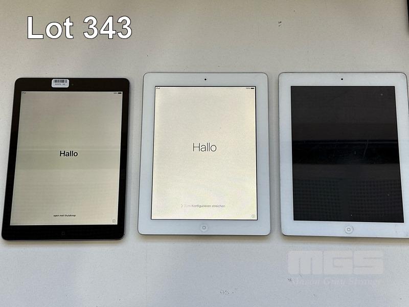3 x APPLE iPADS INC. - APPLE iPAD AIR, 32GB, MODEL A1474 (LOCKED TO iCLOUD) - APPLE iPAD 2, 32GB, MODEL A1395 (LOCKED TO iCLOUD) - APPLE iPAD 2, 16GB, MODEL A1395 (ENGRAVED, FAULTY SCREEN) (NO CABLES, NO CHARGERS) S/N:DMPQ35PDFK11, DLXGWGTYDKPJ, DYVJCSBLDKPH