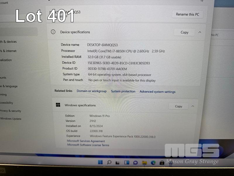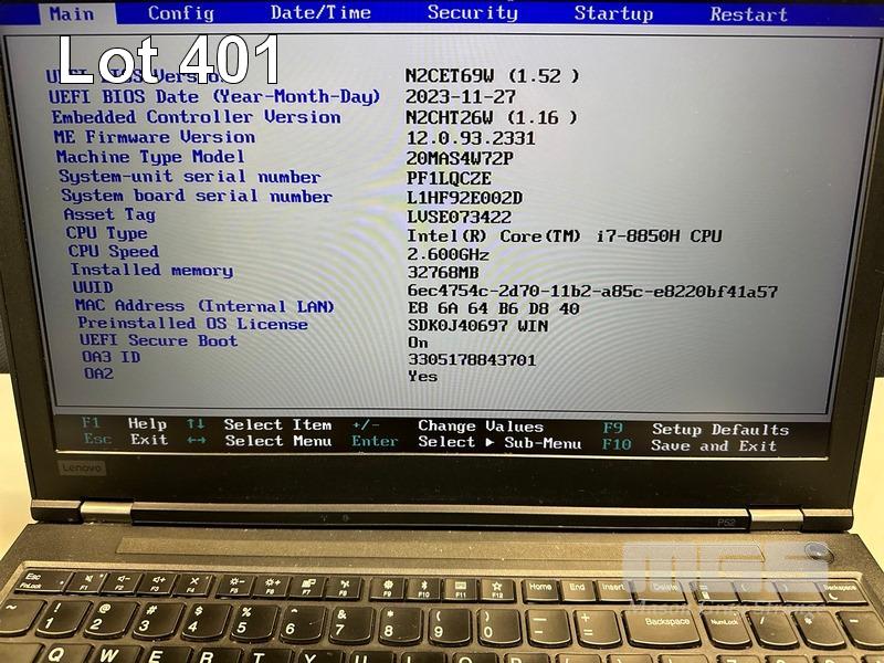 LAPTOP, LENOVO THINKPAD P52 MOBILE WORKSTATION, TYPE 20MA, CORE i7 8850H (8TH GEN) @ 2.6GHz, 32GB DDR4 RAM, 512GB NVMe M.2 SSD, 15.6" WIDESCREEN (1920x1080), 4GB NVIDIA QUADRO P2000 VIDEO, Wi-Fi, BLUETOOTH, WINDOWS 11 PRO INSTALLED (NO POWER SUPPLY) (NOTE: MARKS & SPOT ON SCREEN) S/N:PF1LQCZE