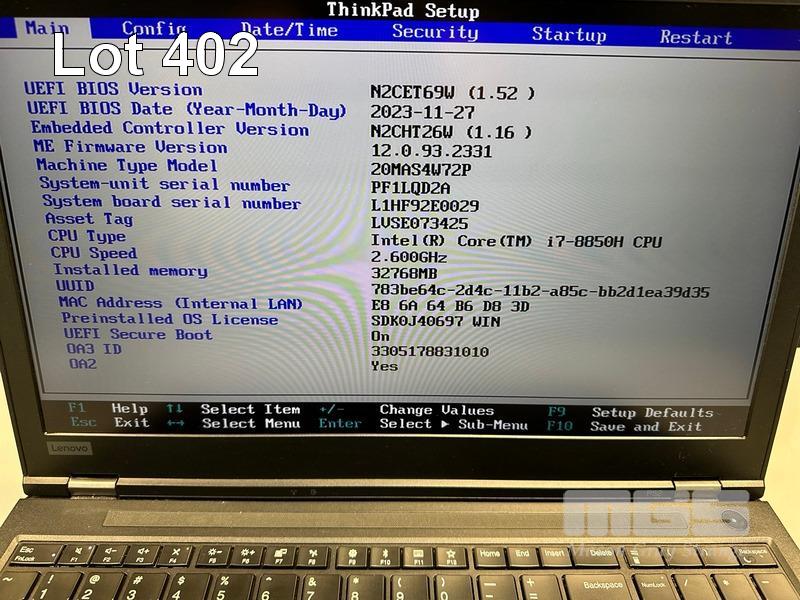 LAPTOP, LENOVO THINKPAD P52 MOBILE WORKSTATION, TYPE 20MA, CORE i7 8850H (8TH GEN) @ 2.6GHz, 32GB DDR4 RAM, 512GB NVMe M.2 SSD, 15.6" WIDESCREEN (1920x1080), 4GB NVIDIA QUADRO P2000 VIDEO, Wi-Fi, BLUETOOTH, WINDOWS 11 PRO INSTALLED (NO POWER SUPPLY) (NOTE: MARKS & SPOT ON SCREEN) S/N:PF1LQD2A