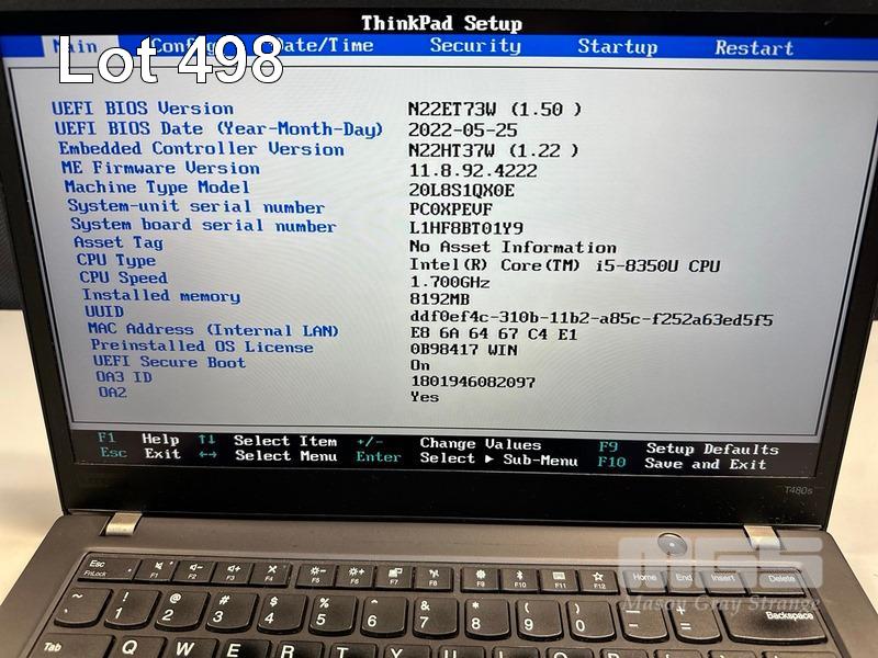 LAPTOP, LENOVO THINKPAD T480s, TYPE 20L8, CORE i5 8350U (8TH GEN) @ 1.7GHz, 8GB DDR4 RAM, 256GB NVMe M.2 SSD, 14" TOUCHSCREEN (1920x1080), INTEL HD VIDEO, Wi-Fi, BLUETOOTH, WINDOWS 11 PRO INSTALLED (NO USB-C POWER SUPPLY) (NOTE: MINOR MARKS ON SCREEN) S/N:PC0XPEVF