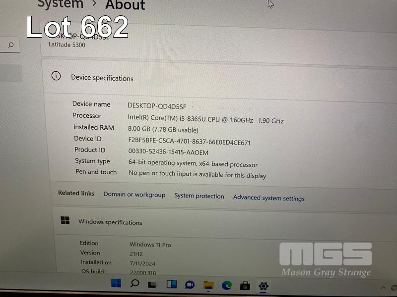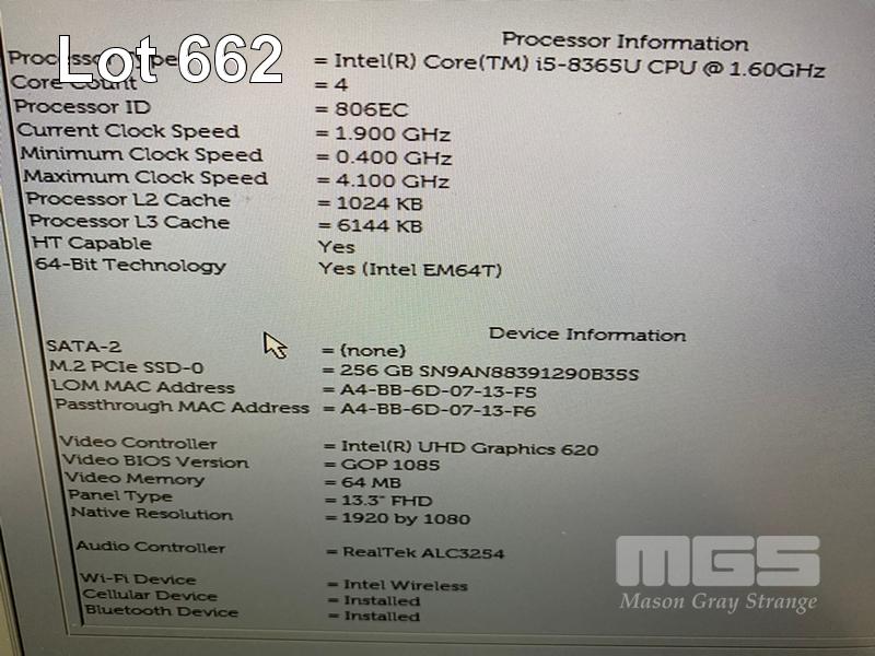 LAPTOP, DELL LATITUDE 5300, CORE i5 8365U (8TH GEN) @ 1.6GHz, 8GB DDR4 RAM, 256GB NVMe M.2 SSD, 13.3" WIDESCREEN (1920x1080), INTEL UHD GRAPHICS 620, Wi-Fi, CELLULAR, BLUETOOTH, WINDOWS 11 PRO INSTALLED (NO POWER SUPPLY) (NOTE: BATTERY NOT HOLDING CHARGE, MARKS ON SCREEN) S/N:7F6WGW2