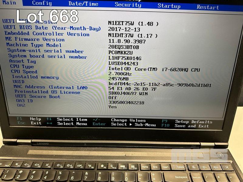 LAPTOP, LENOVO THINKPAD P50 MOBILE WORKSTATION, TYPE 20EQ, CORE i7 6820HQ (6TH GEN) @ 2.7GHz, 24GB DDR4 RAM, 256GB M.2 SSD, 500GB SSD, 15.6" WIDESCREEN (1920x1080), 4GB NVIDIA QUADRO M2000M VIDEO, Wi-Fi, BLUETOOTH, WINDOWS 10 PRO INSTALLED (NO POWER SUPPLY) (NOTE: MARKS & SPOTS ON SCREEN) S/N:PC0MKKZU
