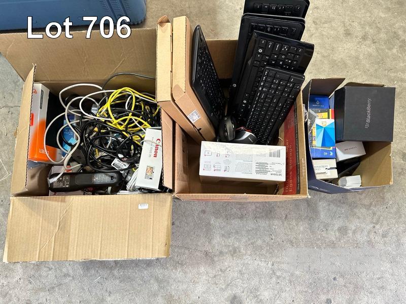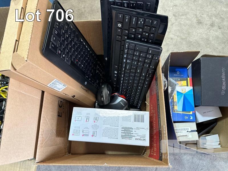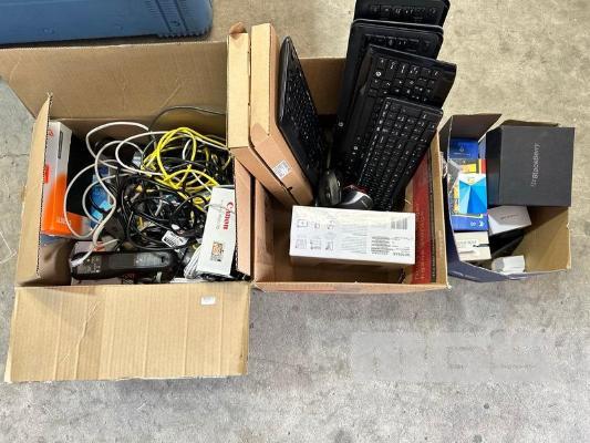 3 x BOXES ASST CABLES, KEYBOARDS, OLD DAMAGED MOBILE PHONES, TELSTRA SMART MODEM ETC