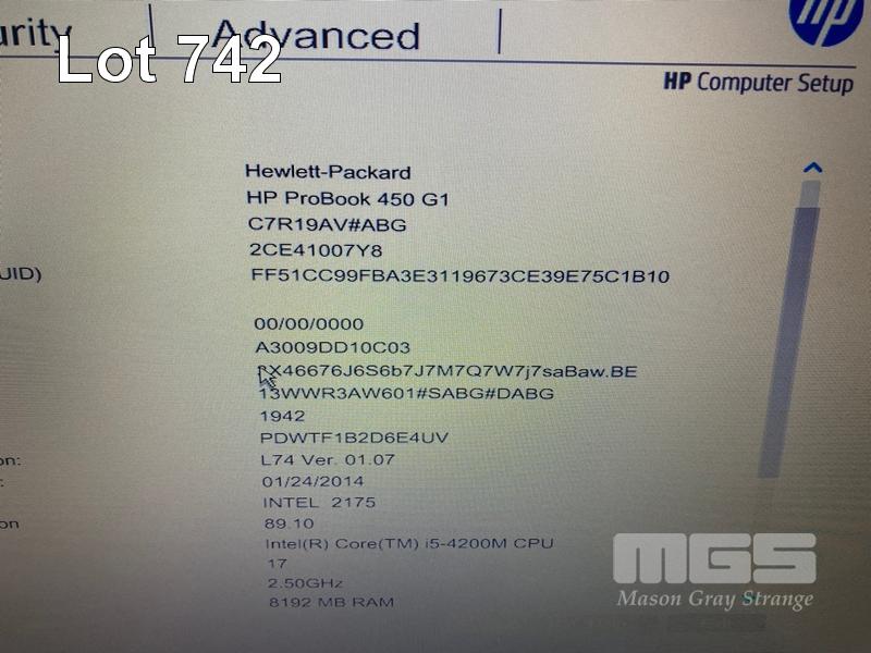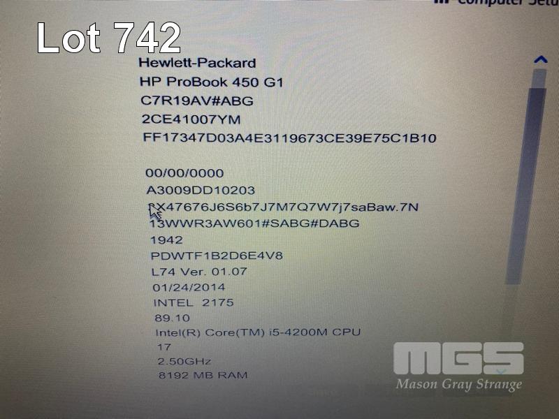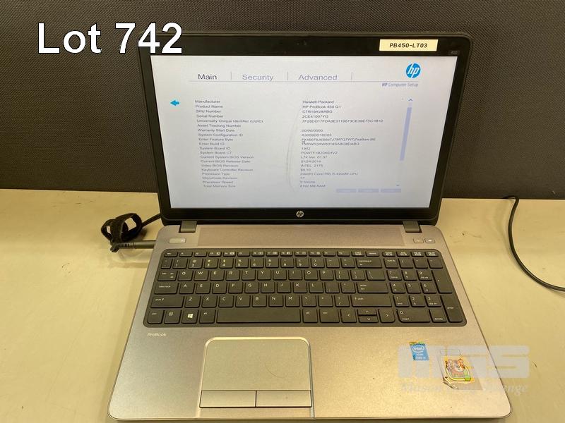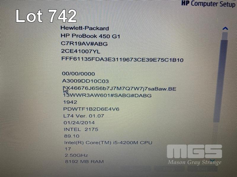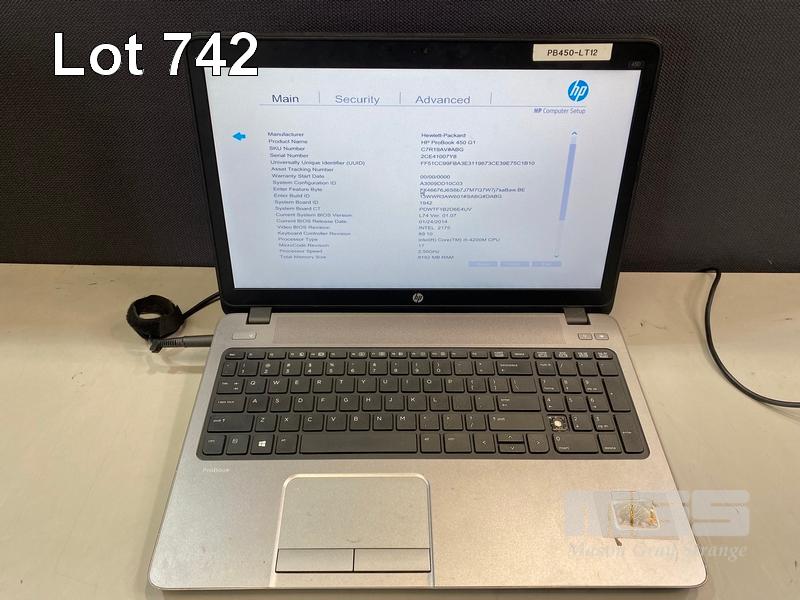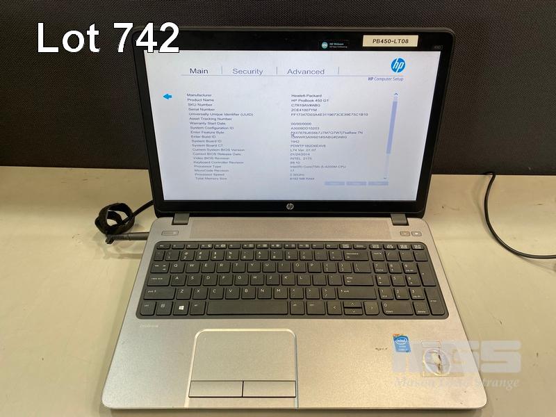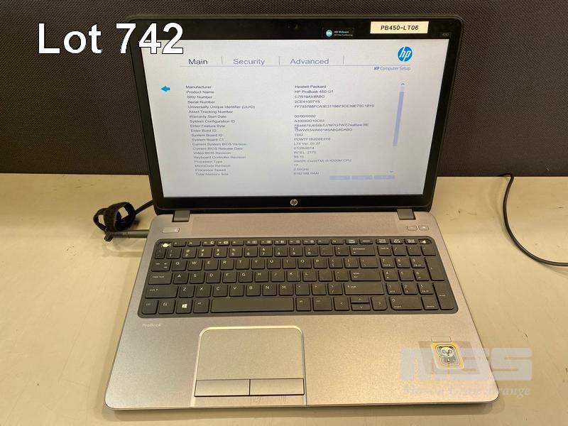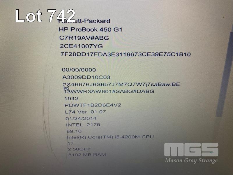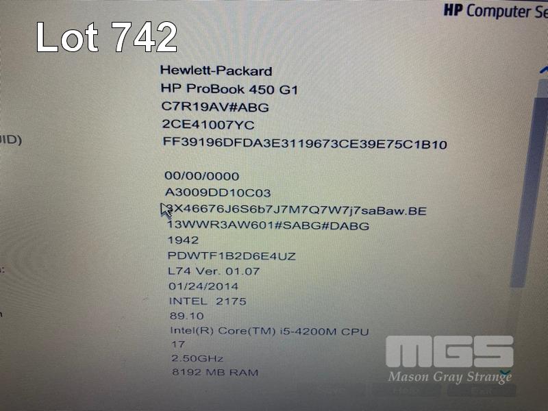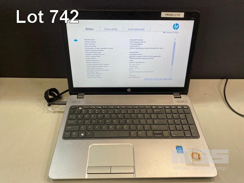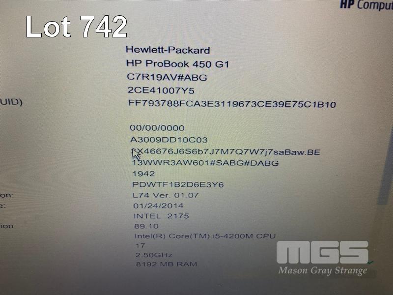 6 x LAPTOPS INC. - 4 x HP PROBOOK 450 G1, CORE i5 4200M @ 2.5GHz, 8GB RAM, 320GB SATA HDD - 2 x HP PROBOOK 450 G1, CORE i5 4200M @ 2.5GHz, 8GB RAM, 500GB SATA HDD (NOTE: 1 x MISSING "F1" KEY, 1 x MISSING KEYPAD "1" KEY, 1 x MISSING "ESC" & "PGDN" KEY, 1 x WITH SCRATCHES ON SCREEN (WITH POWER SUPPLIES) S/N:2CE41007YC, 2CE41007YL, 2CE41007Y8, 2CE41007YM, 2CE41007Y5, 2CE41007YG