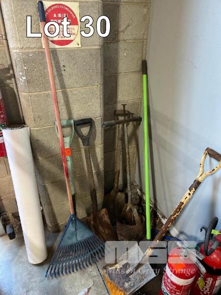 QUANTITY GARDEN TOOLS, RACK, 2 x SHOVELS & 2 x SPADES