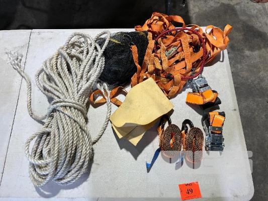 ASSORTED TIE DOWNS, CARGO NET & 30m WHITE NYLON ROPE, 12mm